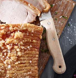 Andesteg og flæskesteg Brunede og hvide kartofler skysauce, rødkål og chips Halve æbler og svesker